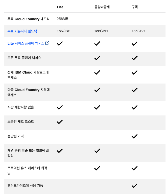IBM Cloud는 Lite, 종량과금제, 구독 이렇게 3가지 유형으로 구분되는데,