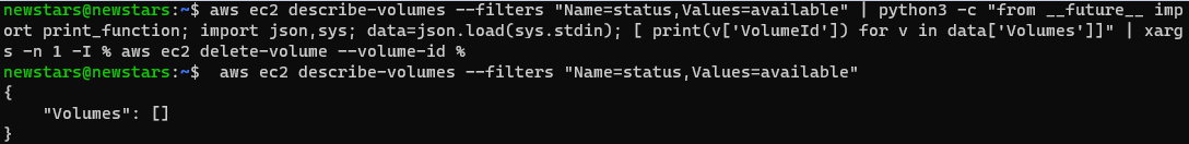 aws ec2 describe-volumes --filters "Name=status,Values=available" | python3 -c "from __future__ import print_function; import json,sys; data=json.load(sys.stdin); [ print(v['VolumeId']) for v in data['Volumes']]" | xargs -n 1 -I % aws ec2 delete-volume --volume-id %