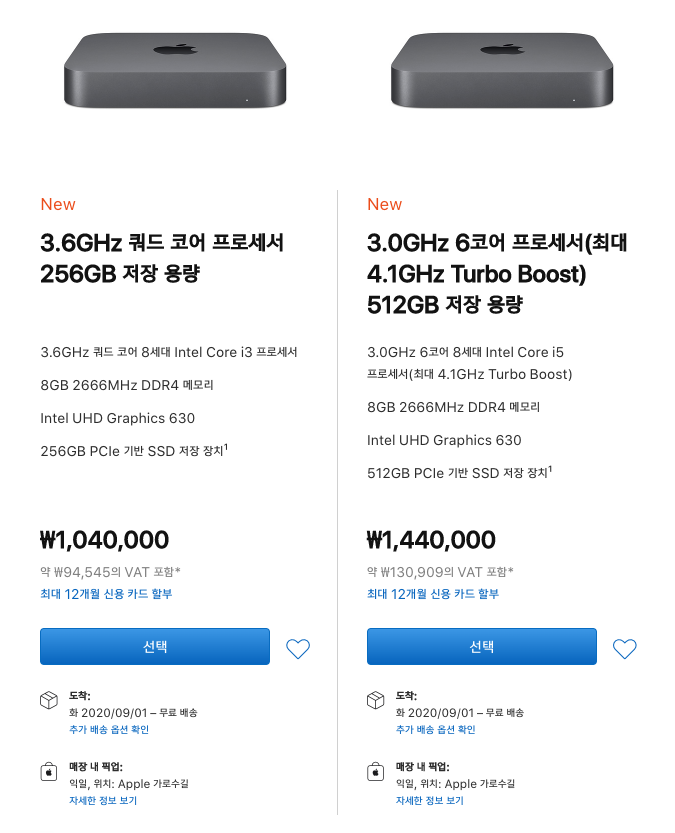 맥미니는 모델이 크게 2개인데, 집에서 쓰는 거니 고사양은 필요 없어서 기본으로 구매했다.