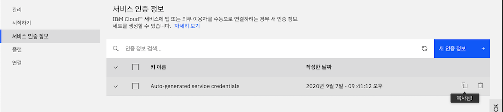 서비스 인증정보 메뉴에 들어가면 오른쪽 휴지통 옆에 복사하기 아이콘을 클릭하면 자동으로 복사가 된다.