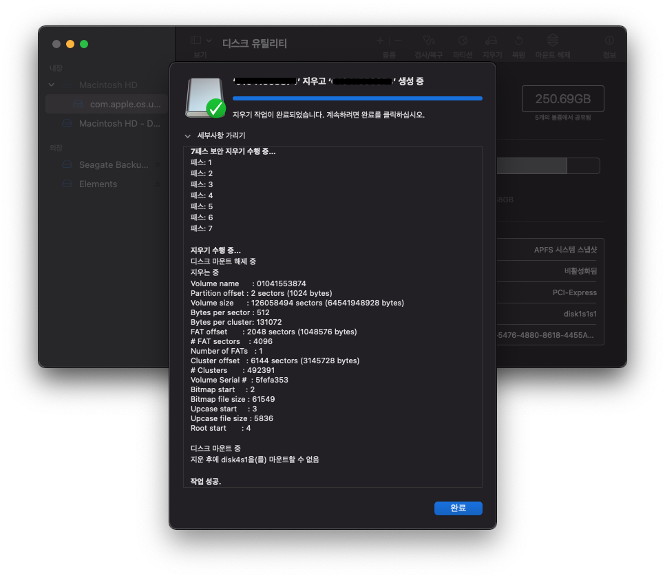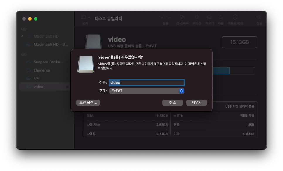 특정 드라이브를 선택하고 상단에서 지우기 버튼 클릭