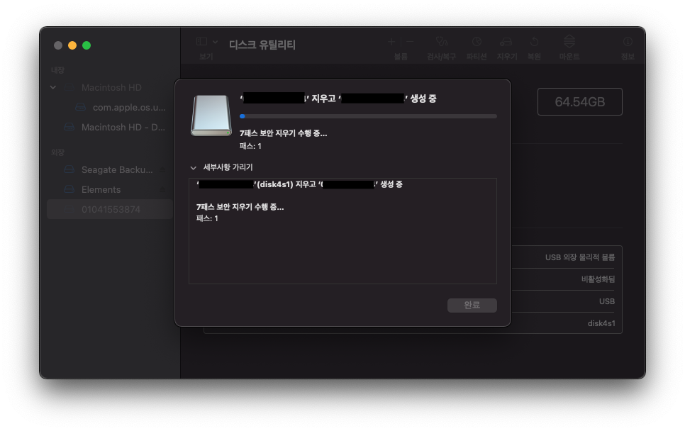 이동 > 유틸리티 > 디스크 유틸리티를 실행하자.