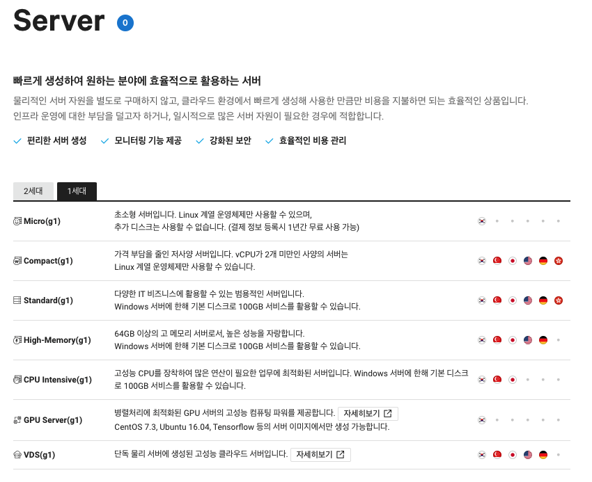 Server 메뉴에서 1세대를 보면 결제등록시 1년간 무료사용이 가능하다.