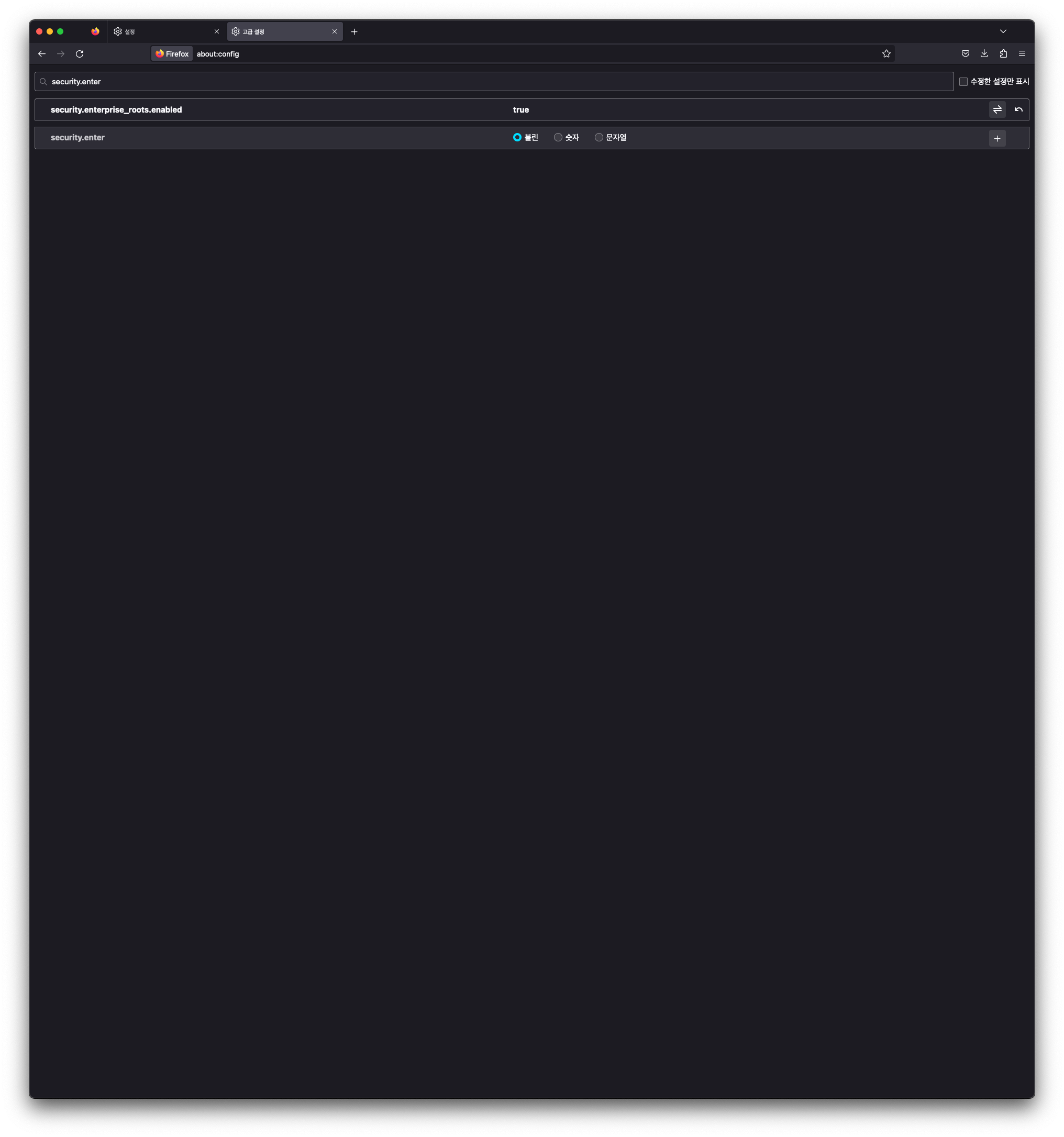 그리고 security.enterprise_roots.enabled 를 false 에서 true 로 변경해줍니다.