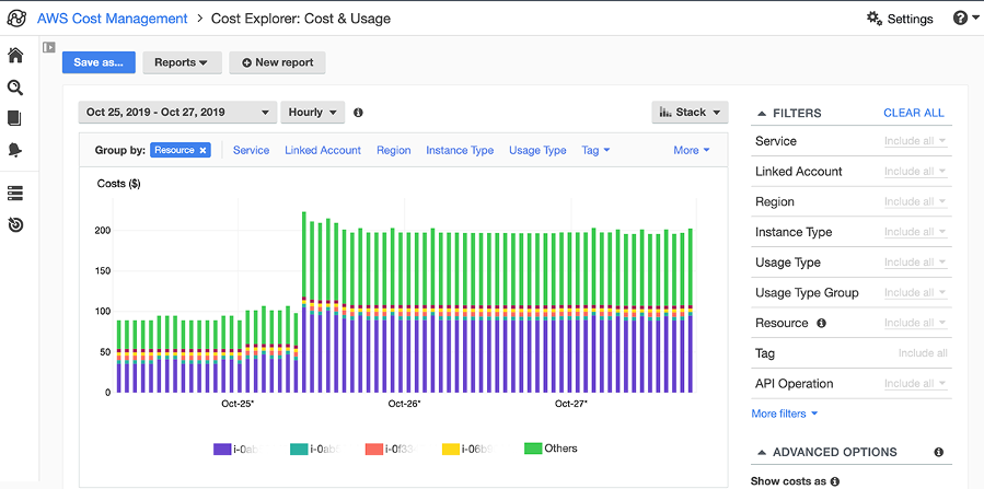 그런 다음 AWS Cost Explorer를 사용하여 AWS 비용 및 사용량을 보고 분석합니다. 이 도구는 높은 수준(예: AWS 계정, AWS 서비스) 또는 리소스 수준(예: EC2 인스턴스 ID)에서 비용과 사용량을 시각화하는 데 도움이 되는 기본 보고서를 제공합니다. '연결 계정별 월별 비용 보고서'를 사용하여 비용이 가장 많이 발생하는 계정을 식별하는 것부터 시작하세요. 다음으로, 해당 계정 내 비용에 기여하는 주요 서비스를 식별합니다. "서비스별 월별 비용 보고서"를 사용하여 이를 수행할 수 있습니다. 시간별 및 리소스 수준 세분성과 태그를 사용하여 비용이 가장 많이 발생하는 리소스를 필터링하고 식별합니다.