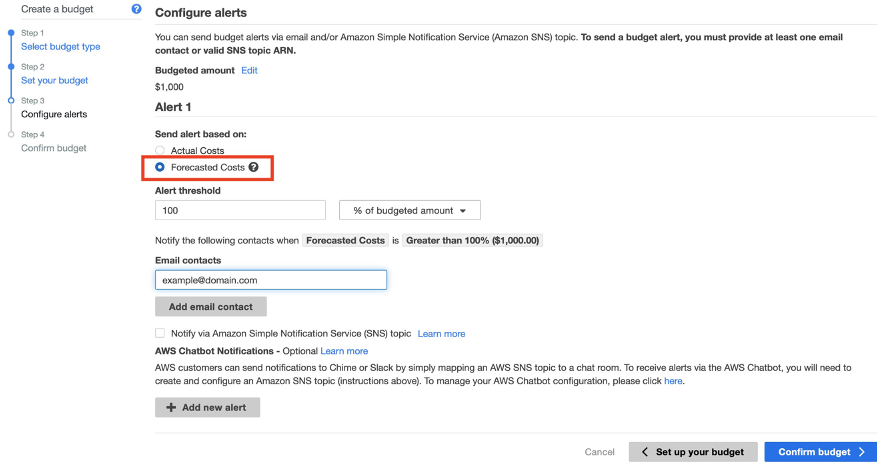 예산을 사용하면 예상 비용(실제 비용은 아님)에 대한 알림도 설정할 수 있습니다. 이를 통해 문제를 미리 예방하고 사전에 비용을 절감할 수 있습니다.