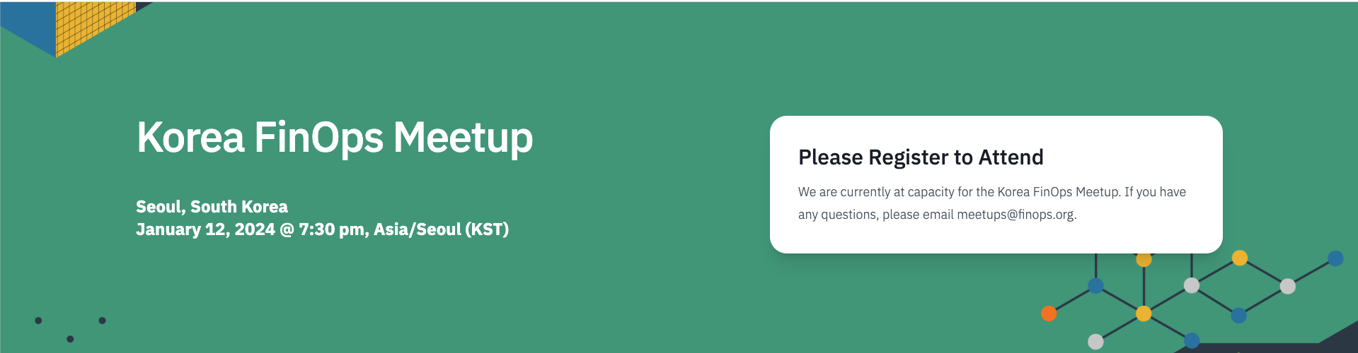 # FinOps 한국 커뮤니티 행사 안내 24년 4월 Meetup [](https://events.finops.org/event/korea-finops-meetup/) ``` 2024년 4월 19일 (금) 7:30 PM 한빛미디