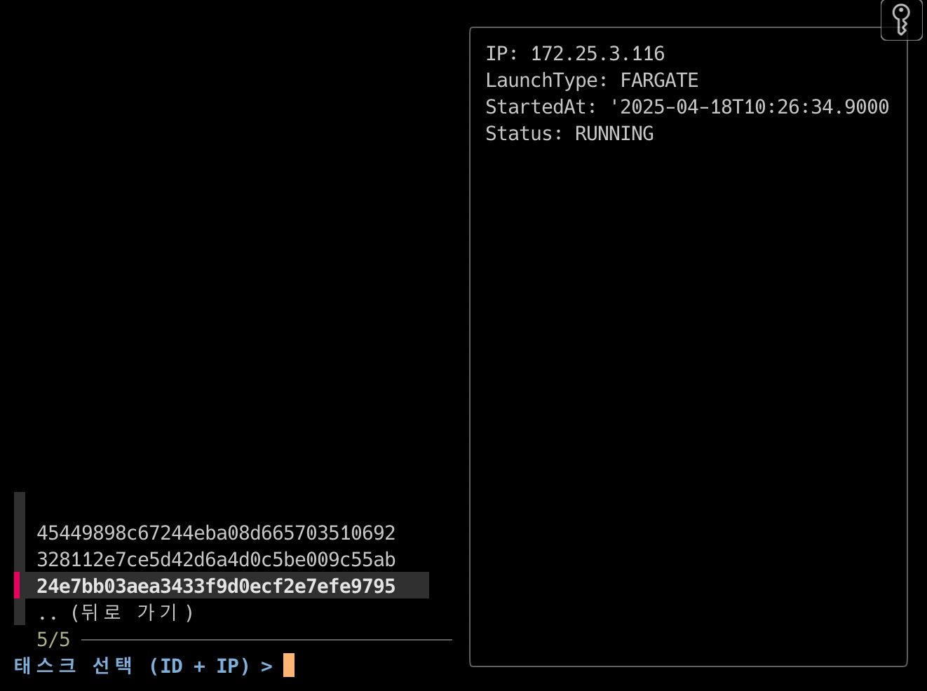 AWS SSO 설정된 모든 프로필을 불러오게 되어있고, ECS 컨테이너, ECS 서비스, TASK에 순서대로 접속할 수 있게 되어있다.